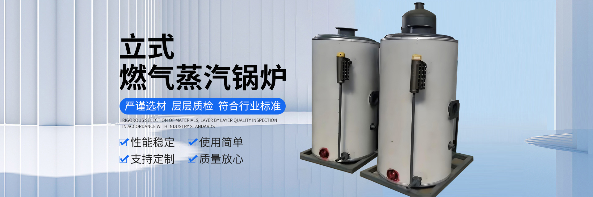 產品有燃氣蒸汽發生器、生物質蒸汽發生器、電加熱蒸汽發生器、熱風爐、燃油蒸汽發生器,鍋爐輔機,模溫機,浴室專用熱水鍋爐,養殖鍋爐等。產品豐富多樣化,廣泛用于服裝紡織行業、食品加工行業、包裝機械、電鍍化工、橋梁鐵路養護、木板竹制品加工、賓館酒店。產品遠銷國內外市場,深受廣大用戶的歡迎。